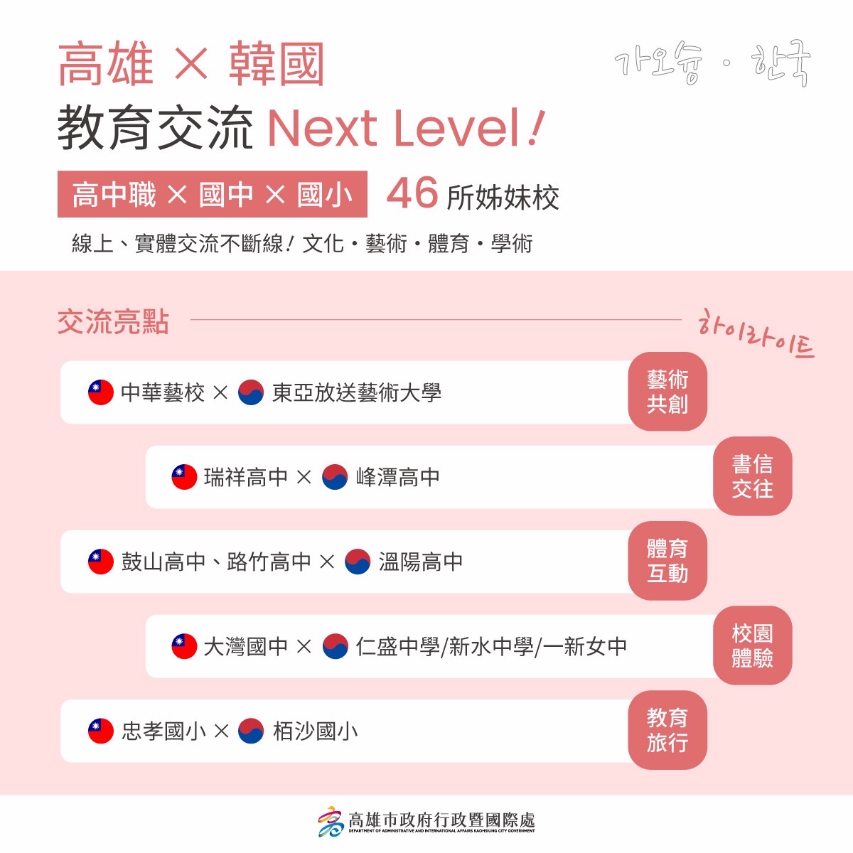 教育局長吳立森表示,過埤國小在2013年與韓國龍湖初等學校締結姊妹校,如今高雄已與韓國建立46所姊妹校。透過線上交流、筆友計畫及實體互動,各級學校在藝術共創及體育交流等面向都有豐富的國際交流。行政暨國際處長張硯卿則指出,高雄致力與國際交流,與韓國城市也發展出深厚情誼,自1966年高雄與釜山締結姊妹市,並拓展至鹽埕區與釜山東區缔結姊妹區,高雄港與韓國最大港釜山港亦成為姊妹港,藉由海港城市緊密連結,持續深化交流。