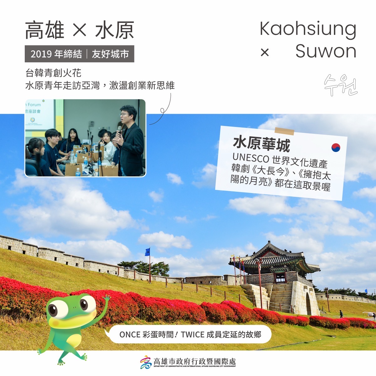高雄在地表演團體勝秋戲劇團與麒麟原住民文化藝術團近年也受邀登上友好城市大田的年度盛事「零時慶典」,以精湛演出展現高雄多元文化;大邱市亦每年邀請高雄大學生參與國際夏令營,培養青年世代友誼。水原市青年代表團則於今年參訪高雄亞灣新創園,並與高雄青年創業家進行互動交流。高雄亦持續拓展與韓國城市的多元合作,今年3月高雄與韓國高陽市簽署城市合作備忘錄,雙邊透過互訪在智慧城市、教育及產業持續擴大交流。