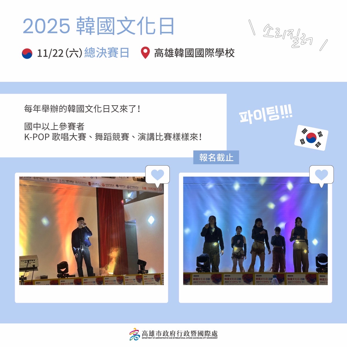 此外,本週末將登場的「韓國文化日」,由高雄市韓人會、高雄韓國國際學校及高雄世宗學堂共同主辦,透過韓語演說、歌唱與 K-pop 舞蹈競賽,展現年輕世代對韓國文化的熱情;同時與市府合作,共同宣傳高雄與韓國城市的互動。張硯卿表示,高雄不只是演唱會之都,更以城市角色積極走向國際,成為台韓文化交流的指標城市之一。