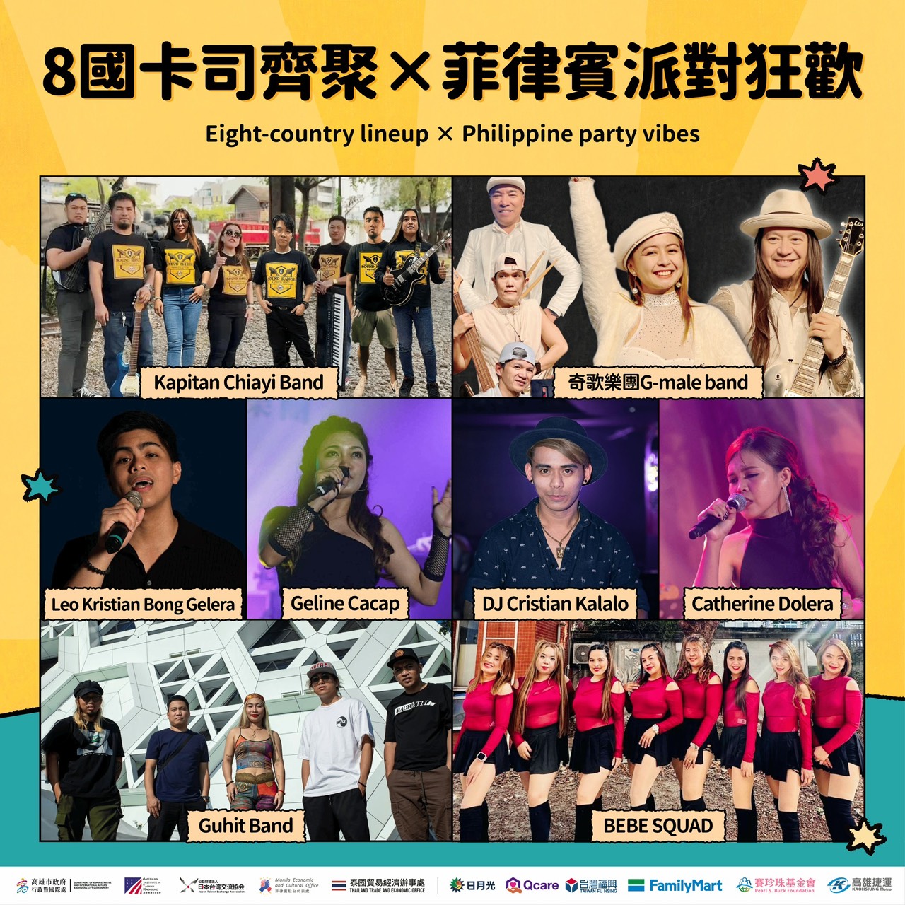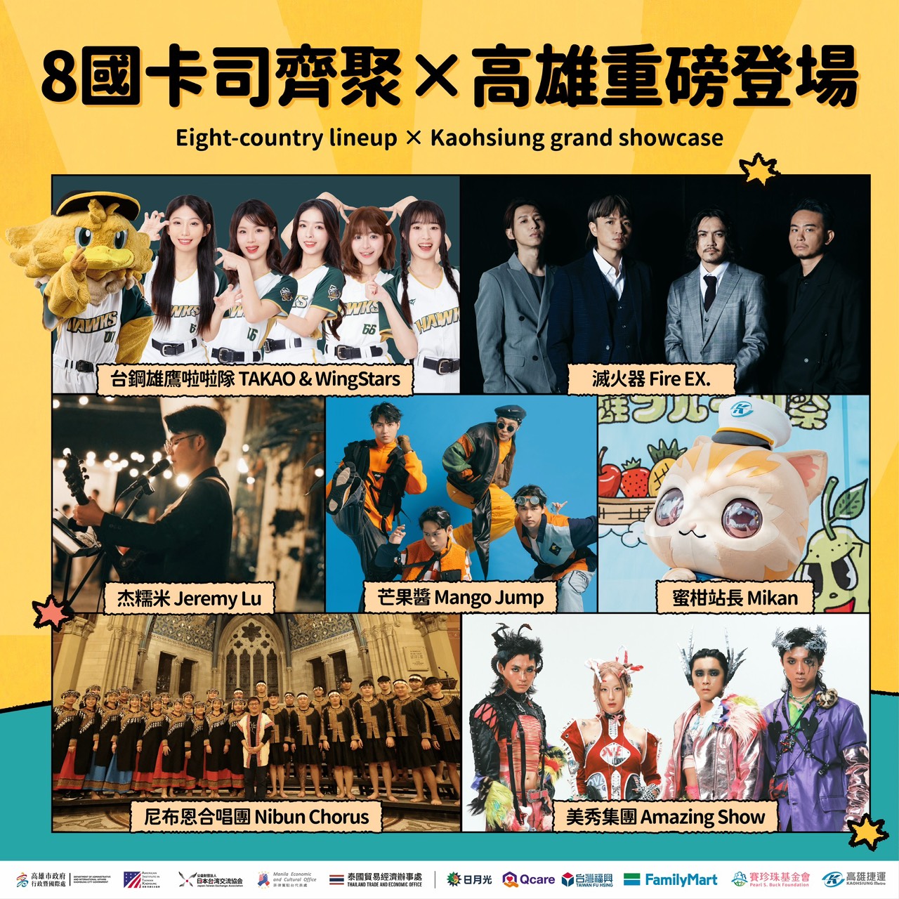 今年八國演出卡司更勝去年,邀請葛萊美六冠得主 Daniel Ho & Friends 以及滅火器、美秀集團、芒果醬等人氣樂團接力開唱;另有尼布恩合唱團、台鋼集團啦啦隊與吉祥物TAKAO、高雄捷運蜜柑站長、泰國樂團 Whal & Dolph、印尼重金屬樂團黑袍樂隊及日月光推薦人氣表演團等輪番登場,國際與在地文化交織,帶來高規格音樂盛宴。