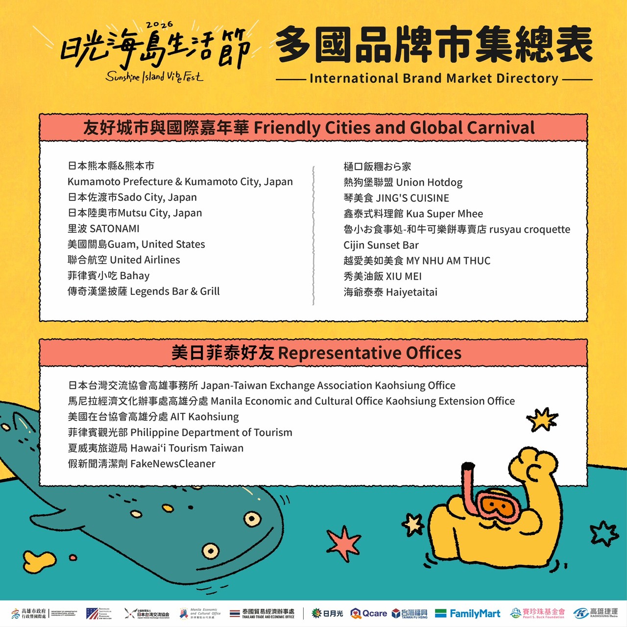 「2026日光海島生活節」由高雄市政府行政暨國際處、美國在台協會高雄分處、日本台灣交流協會高雄事務所、馬尼拉經濟文化辦事處高雄分處及泰國貿易經濟辦事處共同合辦,特別感謝日月光、葵爾特國際企業股份有限公司、台灣福興文教基金會、全家便利商店、賽珍珠基金會及高雄捷運公司等單位熱情支持。