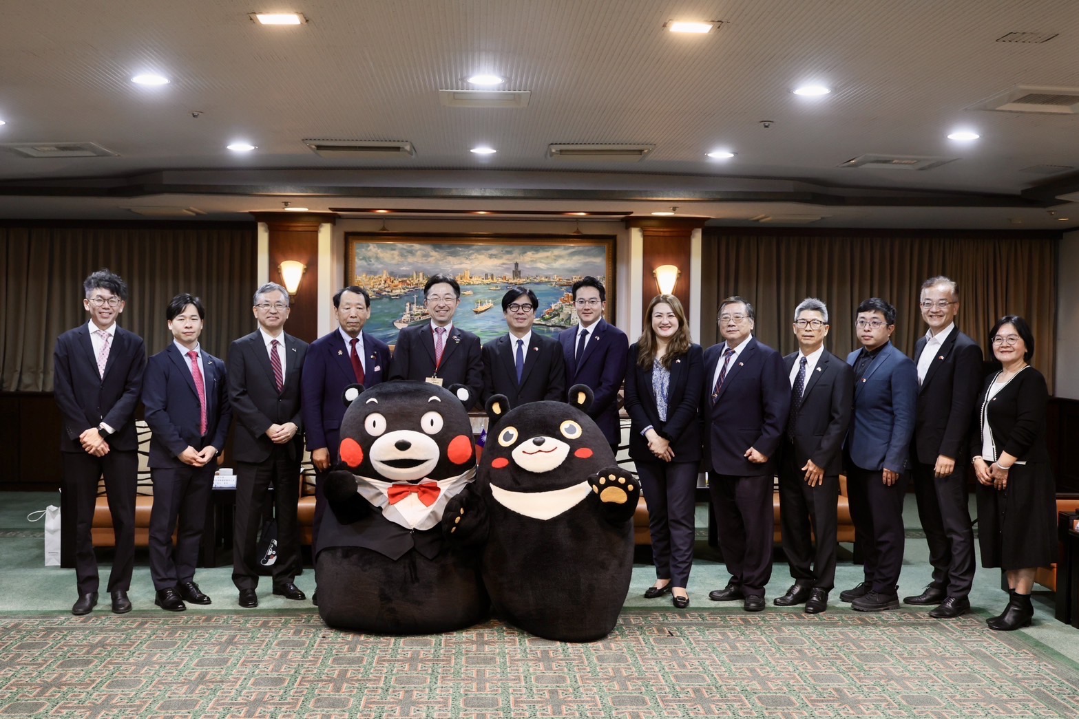 Governor Takashi Kimura of Kumamoto Prefecture, Japan, led a delegation to Kaohsiung for the first time since taking office. Arriving on the 24th via a nonstop Kumamoto-Kaohsiung flight, which resumed in early February, Governor Kimura immediately met with Kaohsiung Mayor Chen Chi-mai. The mascots of Kaohsiung and Kumamoto - Kaohsiung Bear and Kumamon, often referred to as "brothers," also celebrated together after a long absence, embracing each other, filling the atmosphere with joy. Mayor Chen expressed his delight at resuming direct flights between Kaohsiung and Kumamoto, noting that flights from Kaohsiung to Kumamoto are often fully booked. He expressed confidence that the resumption of flights would facilitate faster and smoother bilateral exchanges in tourism, education, and industry.