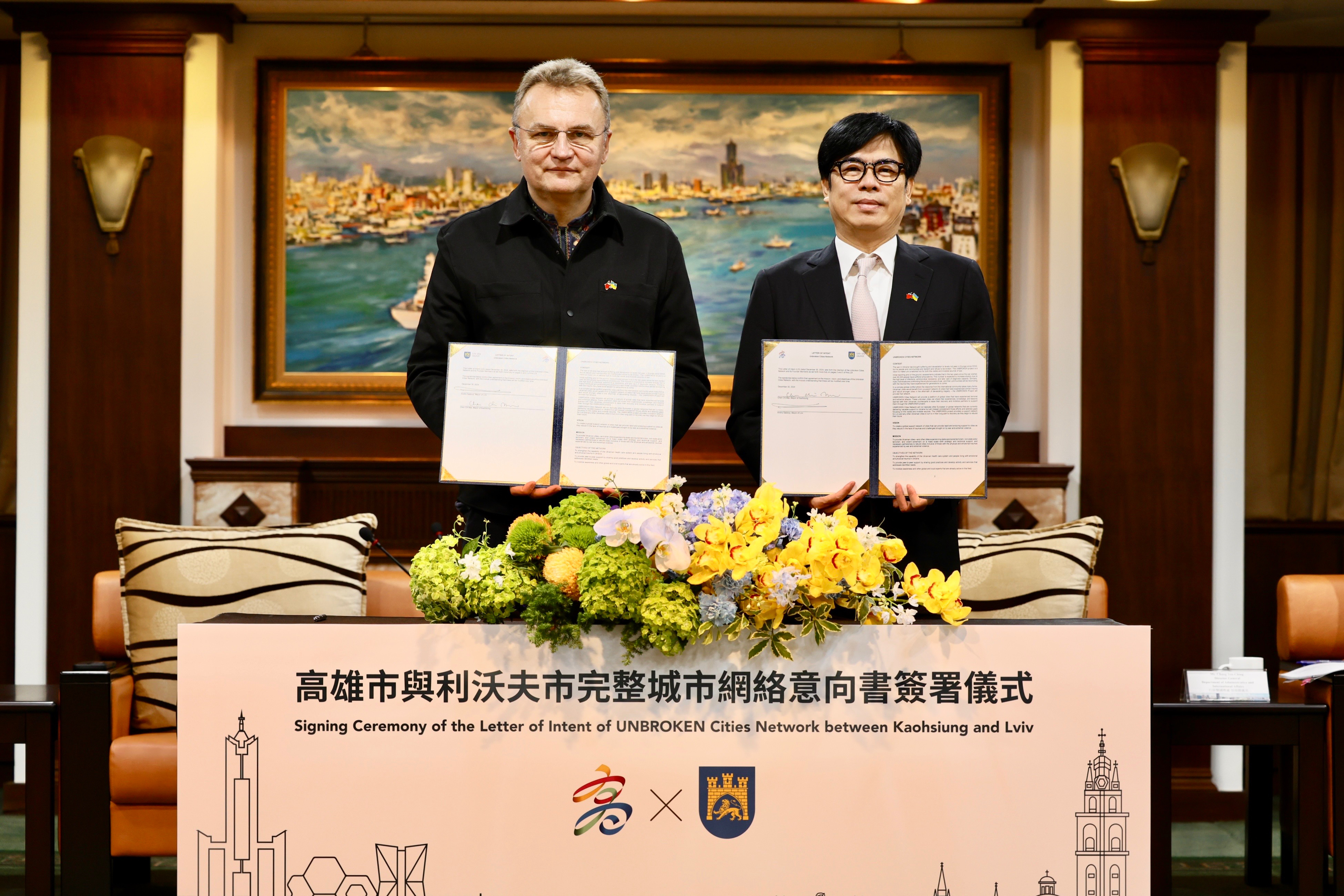 2. 2. Mayor Chen and Mayor Sadovyy jointly signed the letter of intent for the UNBROKEN Cities Network, making Kaohsiung the first Asian city to join the network and symbolized the spirit of mutual assistance, the pursuit of urban resilience, and the commitment to democracy and peace.